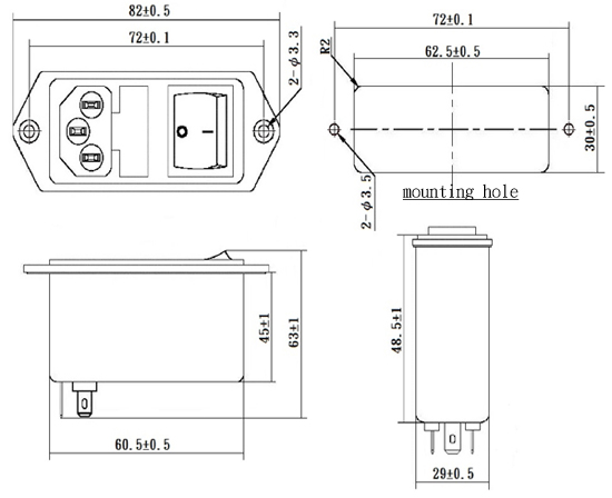 IEC60320 C14 Inlet, with EMI Filter, Switch and Single or Twin Fuses, 3A, 6A or 10A Rating in UL