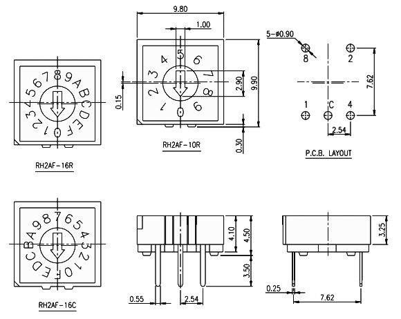 Rotary Encoder switches, 10, 16 STEPS, 4X1, 3X3, 3X2 Termials, Right Angled, Through Hole or SM