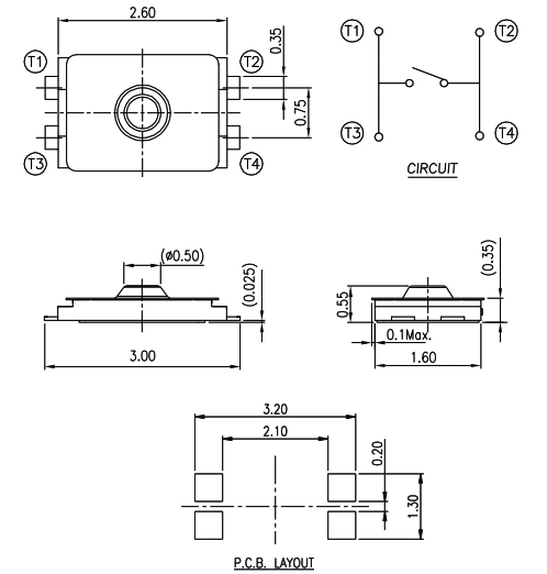 2.6x1.6 Ultra-small SMT Tact Switch, 0.55mm in Height only, 200K Cycles, 160g Operation Force